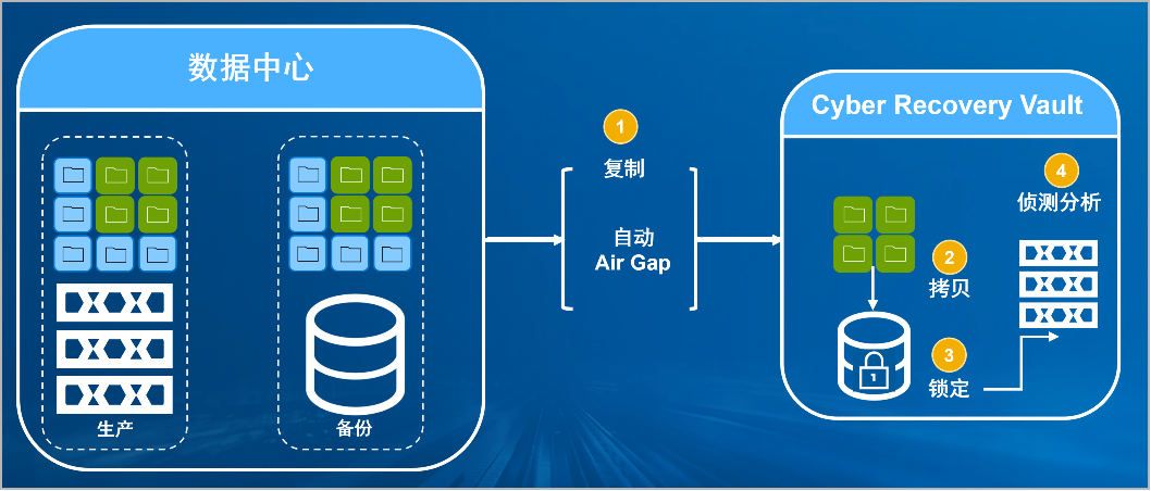 mile米乐集团防勒索病毒方案将生产中心备份数据复制到Vault区,复制后网络自动断开实现弹性隔离。Vault区的数据快速拷贝,并对拷贝版本加锁(在锁定期数据不允许删除和修改)。Vault沙箱内对拷贝版本进行扫描分析,验证数据是否完好。
